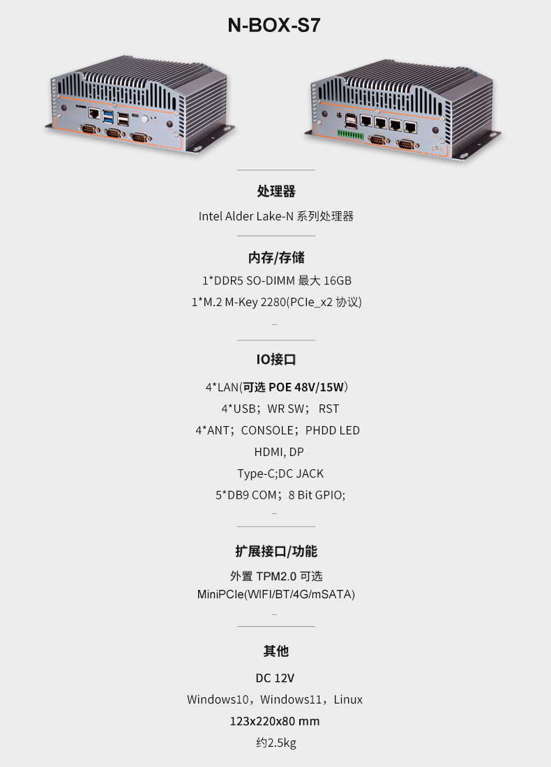 91香蕉在线播放智能N-BOX-S7香蕉视频黄版機搭載Intel Alder Lake-N 係列處理器,多核多線程能加速圖像算法的執行;配合 GPU可以學習優化視覺算法;DDR5內存插槽和M.2的存儲接口,能為檢測係統提供足夠的存儲容量,大幅縮短圖像處理的時間,提高係統的實時性。